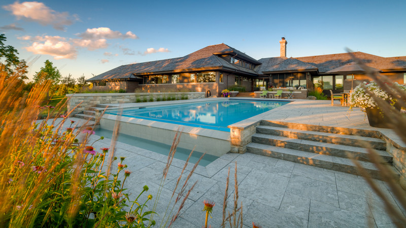 The natural stone kitchen and fireplace are anchored by a custom, flagstone patio.